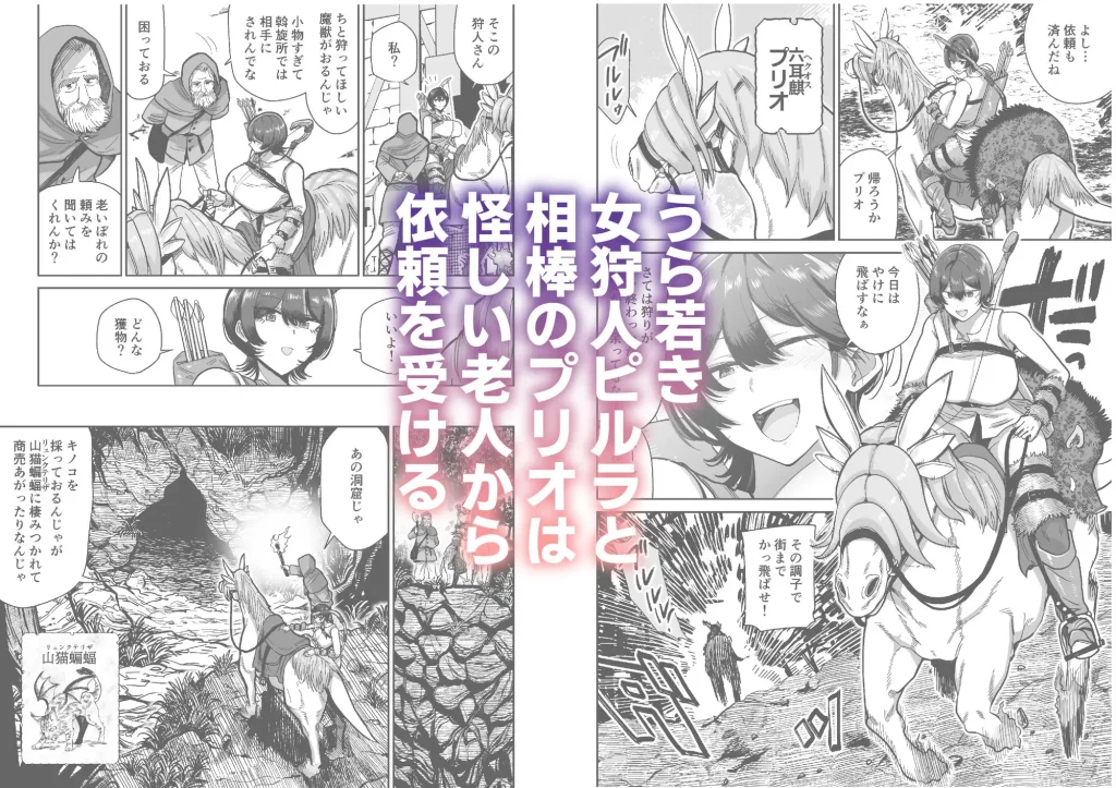 ヒロインであるピルラが老魔術師に騙されて嵌められ(触手にもハメられ)、強制的に発情させられた相棒の魔獣と交尾するというお話です。最初は強制イヤイヤなのですが、魔術の効果もあり気持ちよくなっちゃう。そしてもともと相棒である魔獣との間にさらなる愛が芽生えちゃう展開。